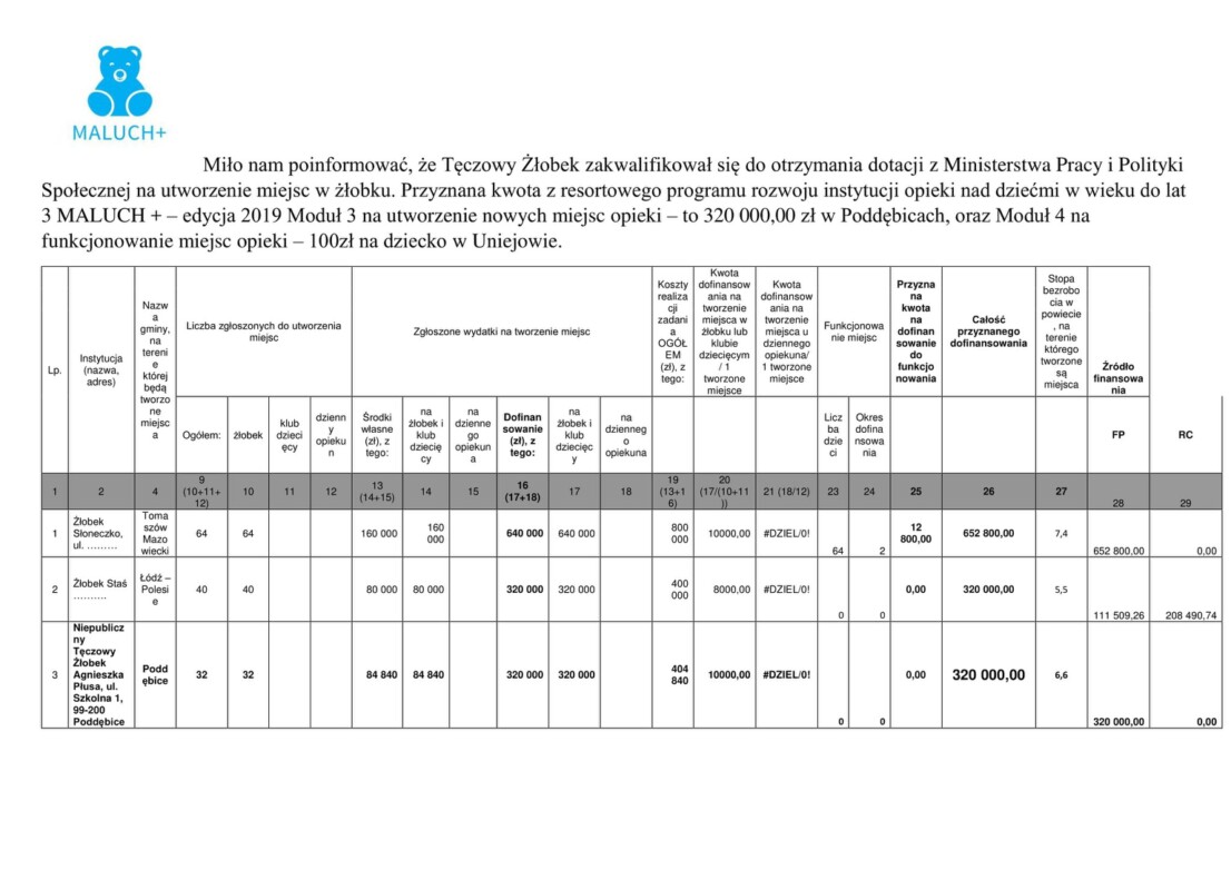 Szanowni Państwo! W związku z relizacją przez nasz żłobek programu MALUCH + na rok 2019 ogłaszamy przetarg