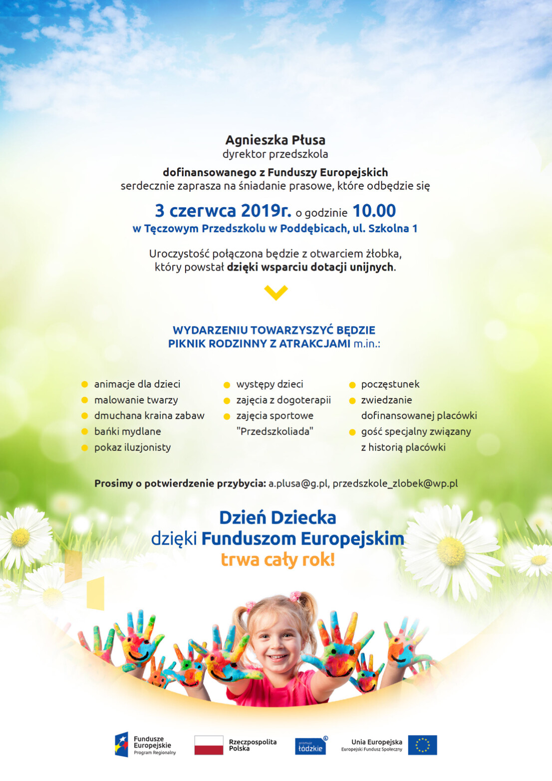 „Nowe miejsca w żłobku w Poddębicach” – projekt współfinansowany ze środków Europejskiego Funduszu Społecznego w ramach Regionalnego Programu Operacyjnego Województwa Łódzkiego na lata 2014-2020 Powrót na rynek pracy osób sprawujących opiekę nad dziećmi do 3 lat . Projekt realizowany będzie od 1 maja 2019r. do 31 grudnia 2020r.