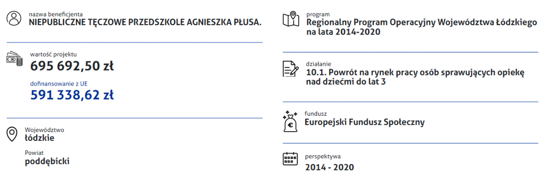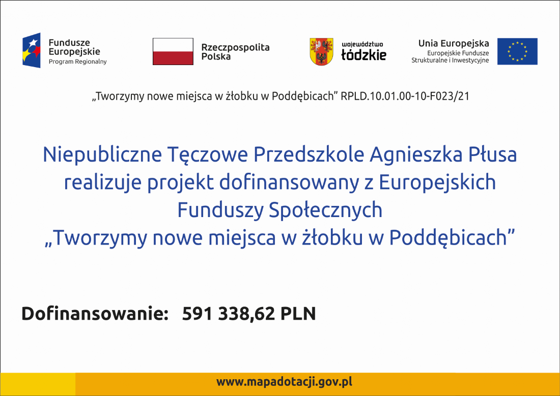 Projekt realizowany . w żłobku w Poddębicach (ul. Szkolna 1), skierowany do 30 rodziców/opiekunów prawnych (28K,2M) z pow. poddębickiego doświadczających trudności na rynku pracy spowodowanych opieką nad dz. w wieku do lat 3.Działania w ramach proj. przyczyniają się do zwiększenia dostępności miejsc żłobkowych w placówce o 30 miejsc (obecnie 57 w żłobku w Poddębicach – 32 ul. Szkolna 1, 25 ul. Łęczycka 5a)i tym samym w powiecie poddębickim. Działania zakładają dostosowanie pomieszczeń do standardów opieki żłobkowej, doposaż. placówki oraz finansowanie codziennego funkcjonowania placówki oraz zajęć dodatkowych. dla nowo przyjętych dz. przez okres 10m-cy. Wartość projektu 695692,50 zł w tym wkład własny pieniężny prywatny – w wysokości 104353,88 zł Wnioskodawca. zapewnia, iż wsparcie w zakresie opieki nad dz. do lat 3 jest realizowane w formach i zgodnie ze standardami opieki nad dz. określonymi w • ustawie z dnia 4 lutego 2011 r. o opiece nad dz. w wieku do lat 3;•rozp. MPiPS z dnia 10 lipca 2014 r. w sprawie wymagań lokalowych i sanitarnych, jakie musi spełniać lokal, w którym ma być prowadzony żłobek lub klub dz.;